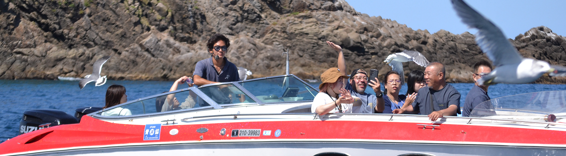 360度絶景が広がるから、ガイドスポットでは写真撮影に最適。最大時速40~50kmで海上を駆け抜け、海の迫力をよりダイレクトに感じ、体に心地よくあたる海風を存分に味わえます。
